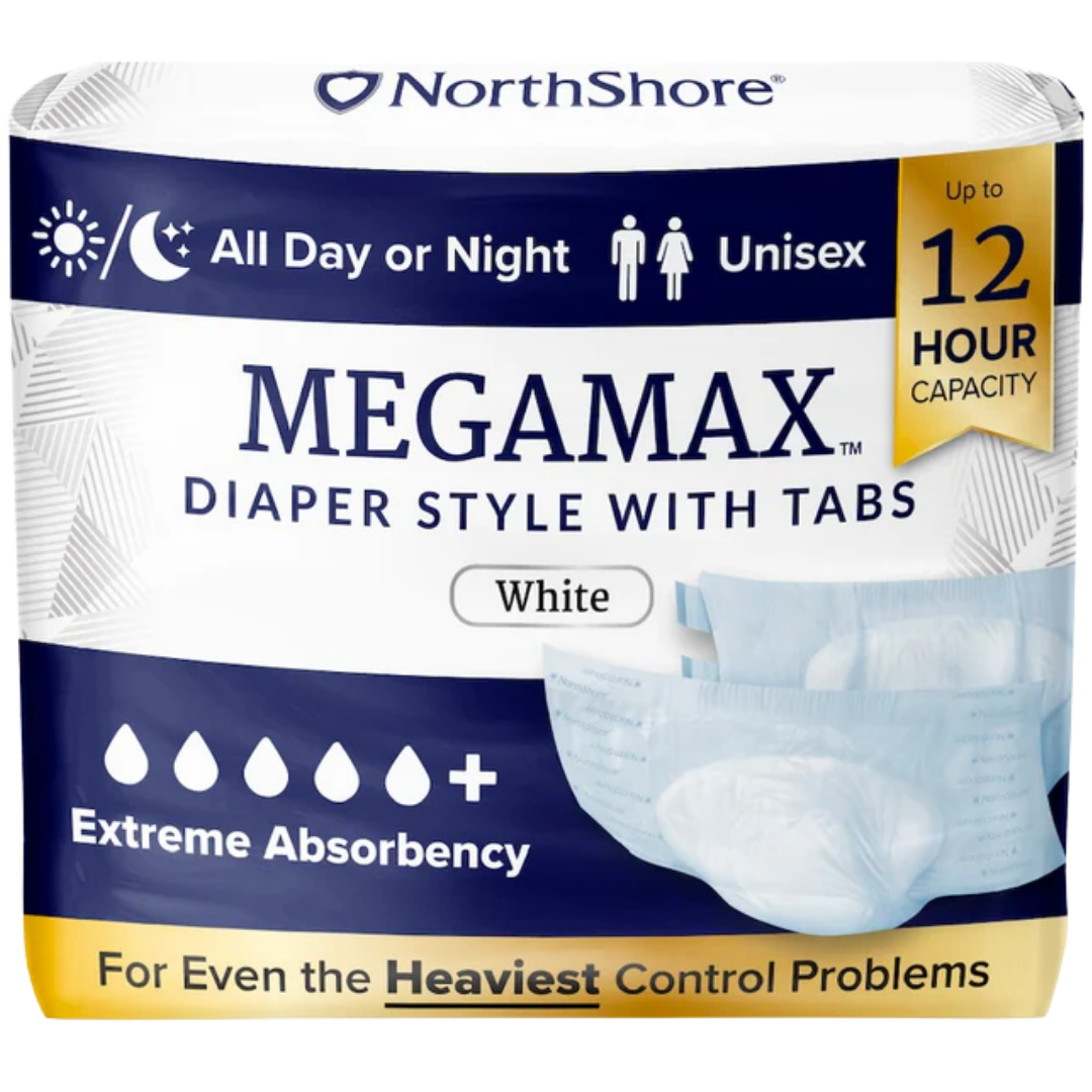 | NorthShore MEGAMAX Adult Diapers | Tranquility All-Through-The-Night Briefs | Abena Abri-Form White Foil Comfort Briefs |
