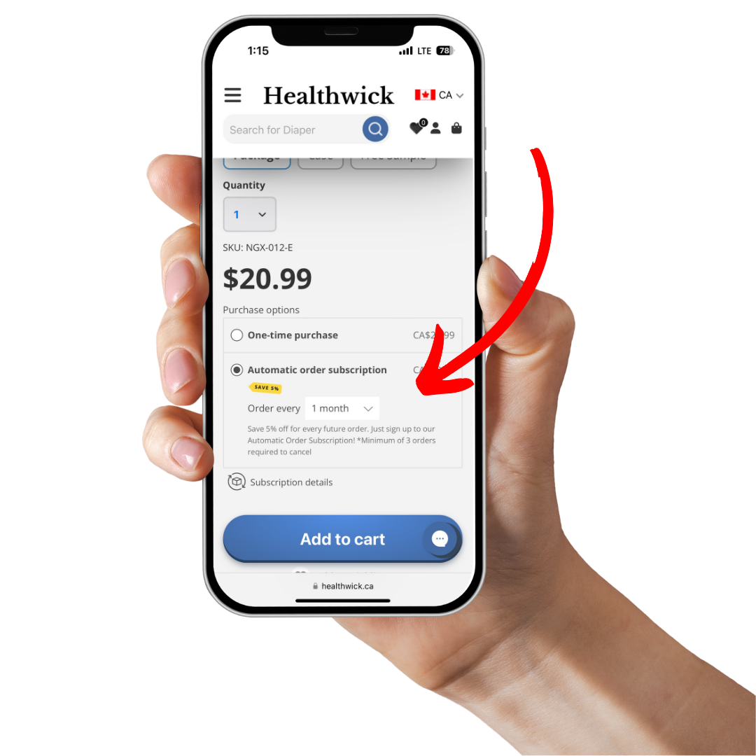 Select how many weeks or months you would like between the delivery of that item. Note that you can place different items on different schedules. For example, you can check out with a subscription to receive a package of briefs every 2 weeks, as well as a tube of barrier cream every month.