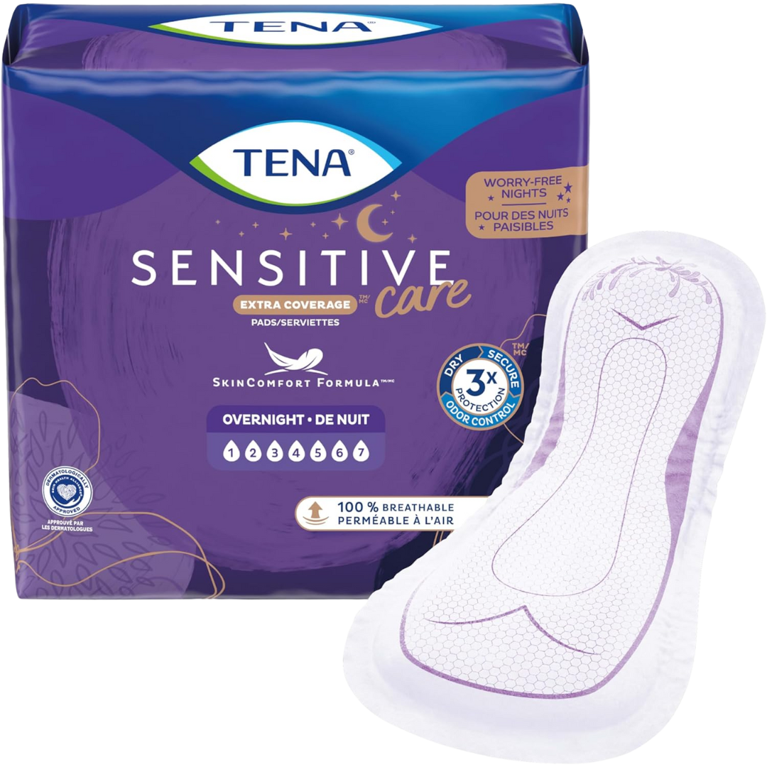 TENA Sensitive Care Overnight PadsTENA Sensitive Care Overnight Pads offer trusted overnight protection for moderate to heavy bladder leakage with a design that keeps you dry, secure, and comfortable while you sleep. With a wider front and back for optimal coverage when lying down, these pads feature a soft top sheet, strong absorbency, and odour control. Sleep soundly knowing TENA has you covered through the night. |
