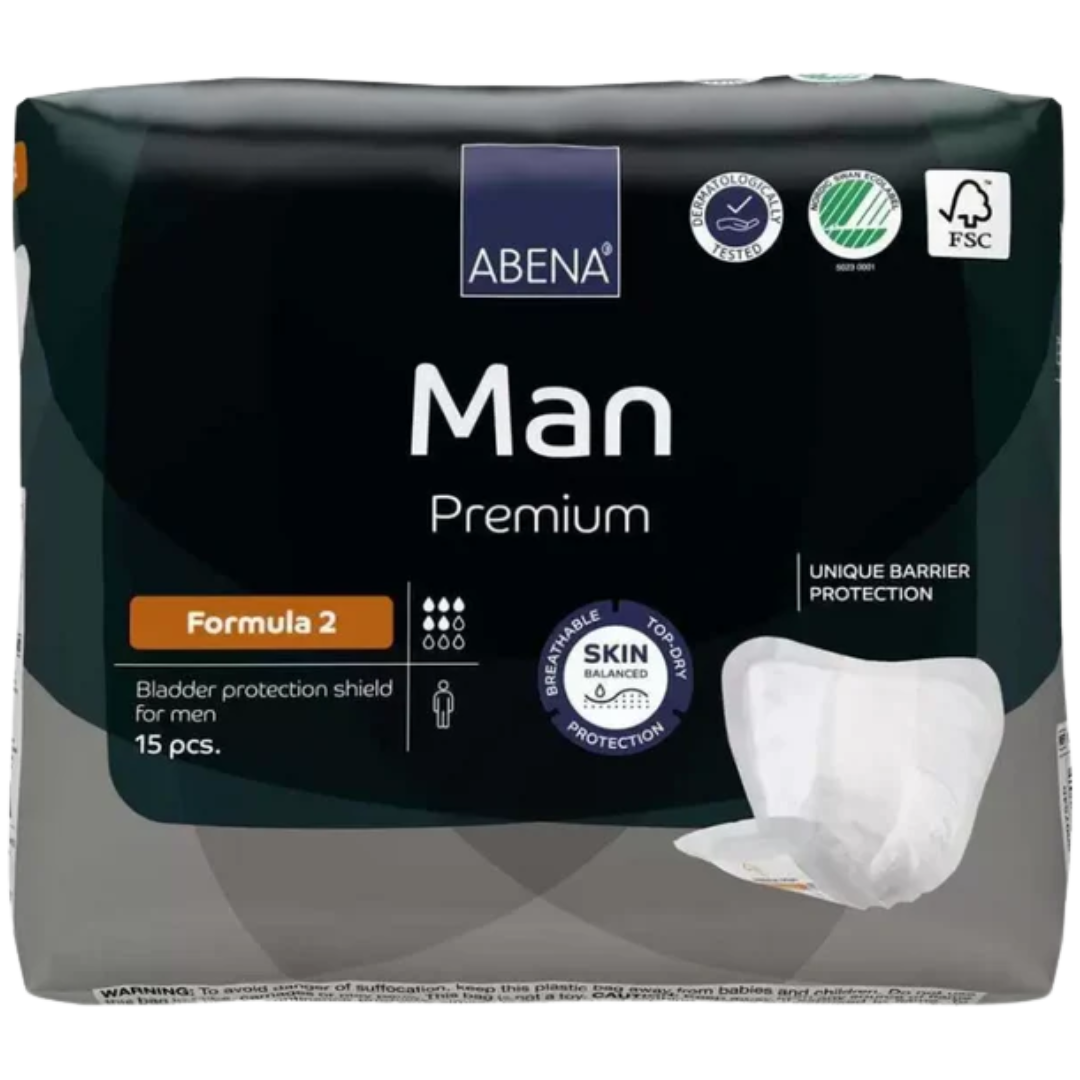Abena-Man Formula 2 Male GuardsDesigned specifically for men, ABENA Man Formula 2 Male Guards provides a secure T-shaped fit with built-in pockets for extra leak protection. Its soft top sheet, high-performance core, and eco-certified materials deliver comfort, dryness, and confidence. |