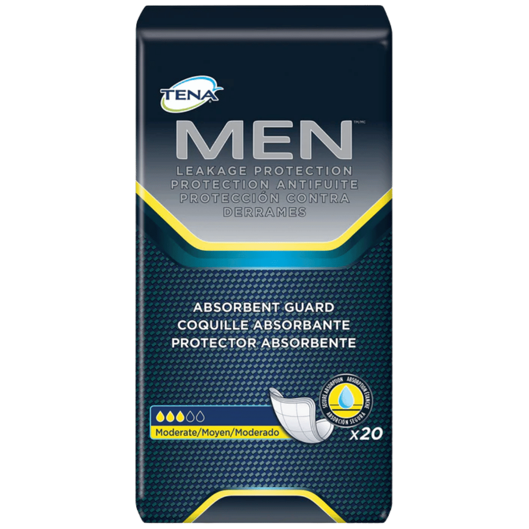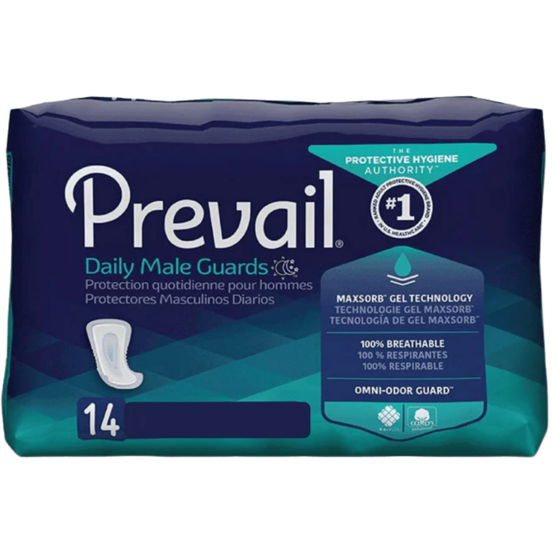 Male Guards: The most popular product for managing light to moderate urinary leakage is the male guard. These male incontinence pads are designed with a contoured shape and absorbent core that offer secure coverage while remaining discreet under clothing. With a strong adhesive backing that secures the guard inside regular underwear, they’re a convenient, low-profile solution for daily use.